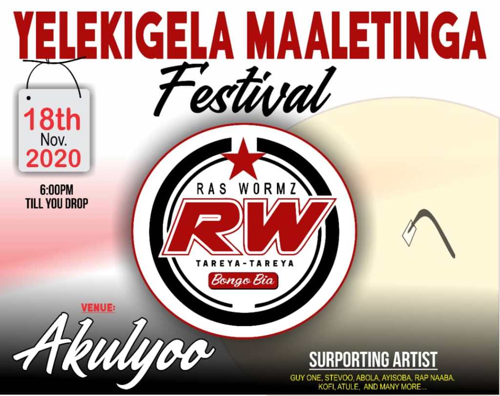 The Yelekigela Maaltinga maiden festival will occur on 18 November 2020 at the Akulyoo community. The festival, which will see Ras Wormz crowned as the Yelekigela Maaltinga Naaba, will be graced by top artists such as Guy One, Stevo Atambire, Abola, King Ayisoba, Rap Naaba, Kofi Atule and many more.